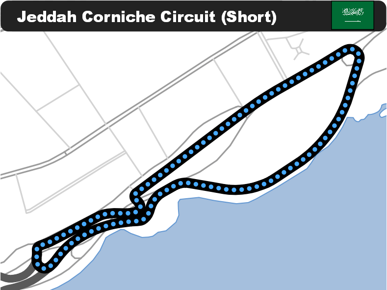 短縮版レイアウトであるが、使用される可能性の高いレイアウトが、2022年にWTCRがジェッダにて開催された際のレイアウトだ。WTCR開催時は、ターン4の後左に曲がり、バックストレートに帰ってくる合計12コーナー/3.45kmのレイアウトが使用された。2.7km短縮される形だが、フォーミュラEのカレンダーでは最も長いサーキットの1つになる形だ。