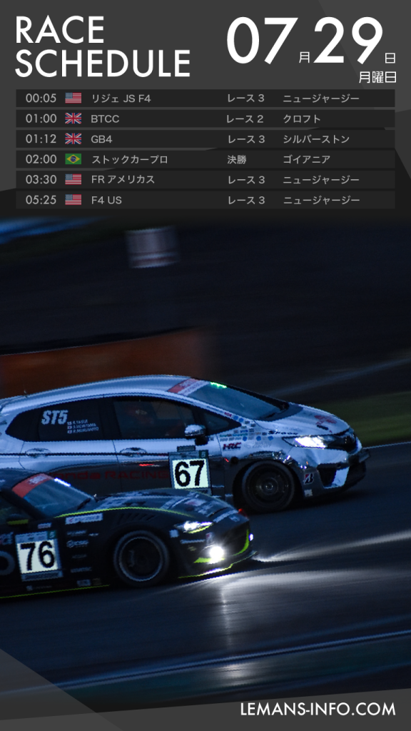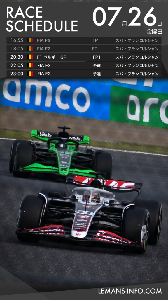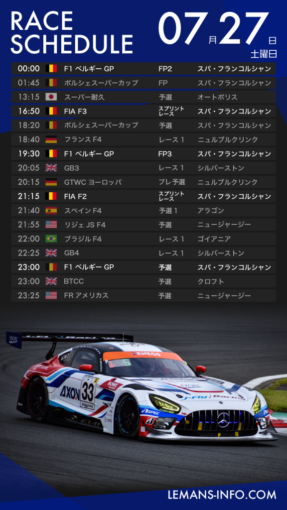 レーススケジュール7月26日から29日までのレーススケジュール。F1はベルギーGP、国内ではスーパー耐久 オートポリス5時間レースが行われる。フィーダーシリーズは加藤大翔が参戦するフランスF4が行われるほか、スペインF4に山越陽悠がスポット参戦する。