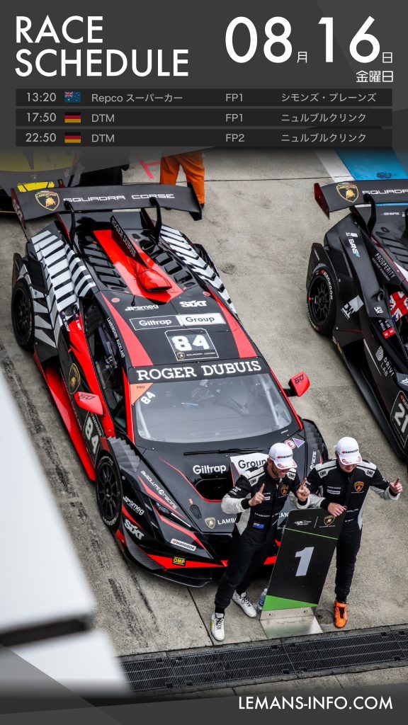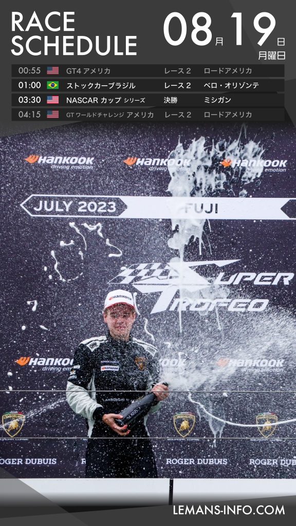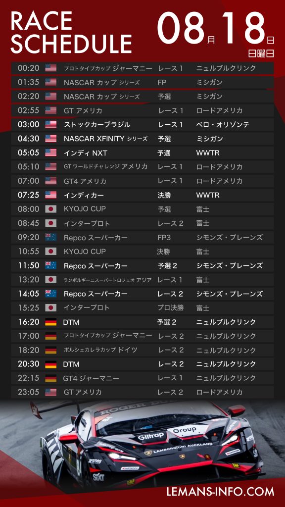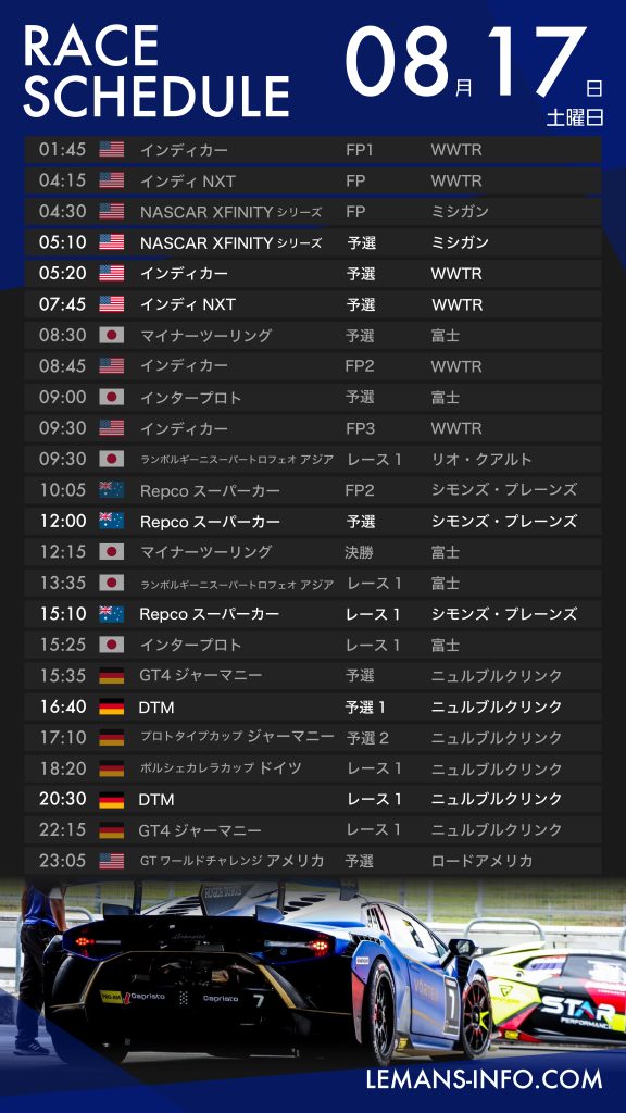 レーススケジュール8月16日から18日までのレーススケジュール。国内では富士にて「富士チャンピオンレース第3戦」が行われ、インタープロト、KYOJO CUP、マイナーツーリング、ランボルギーニスーパートロフェオ・アジアのレースが行われる。海外ではDTM、インディカー、NASCAR、Repcoスーパーカー、ストックカーブラジルなどが行われる。