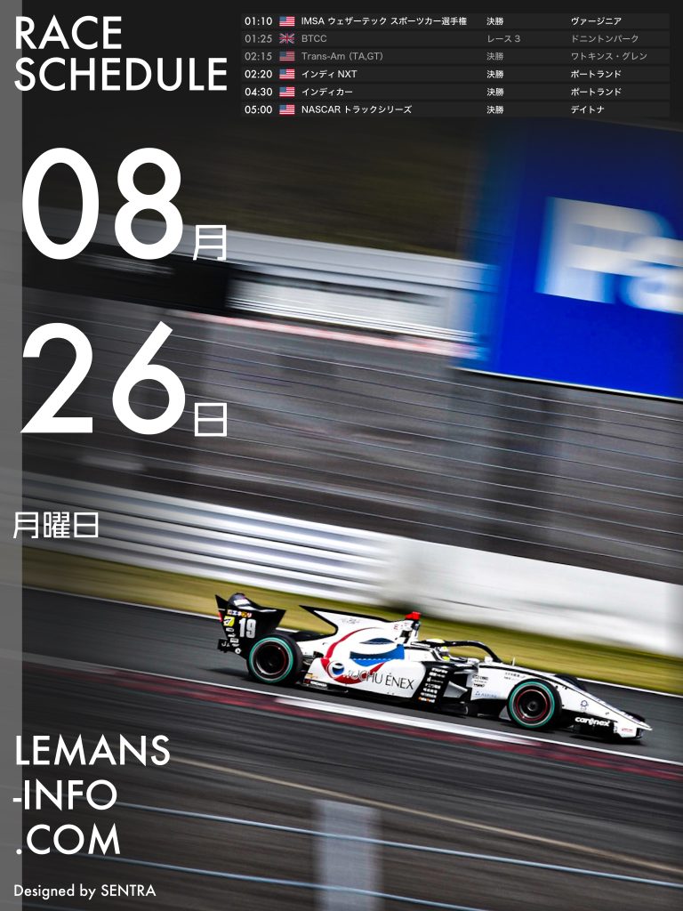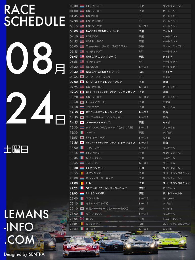 レーススケジュール8月23日から26日までのレーススケジュール。国内ではスーパーフォーミュラ、GTワールドチャレンジアジアが行われる。F1はオランダGPで、ポルシェスーパーカップとF1アカデミーのみ併催される。その他、インディカー、NASCAR、IMSA、GTワールドチャレンジヨーロッパ、ELMSなどが開催される予定。