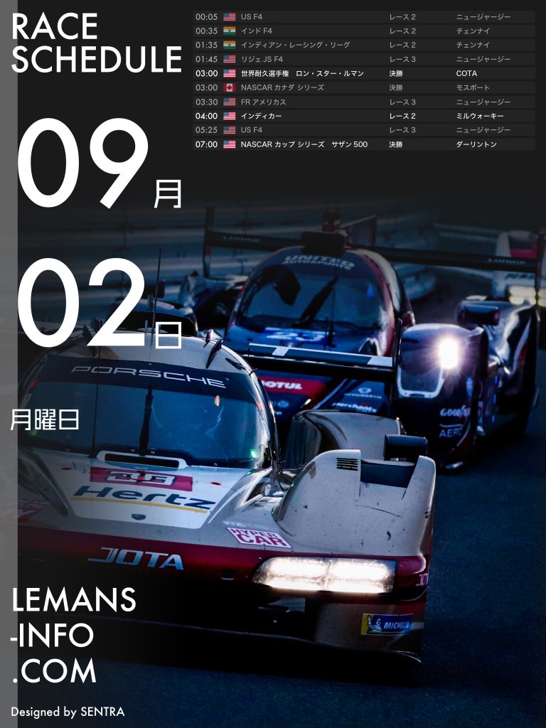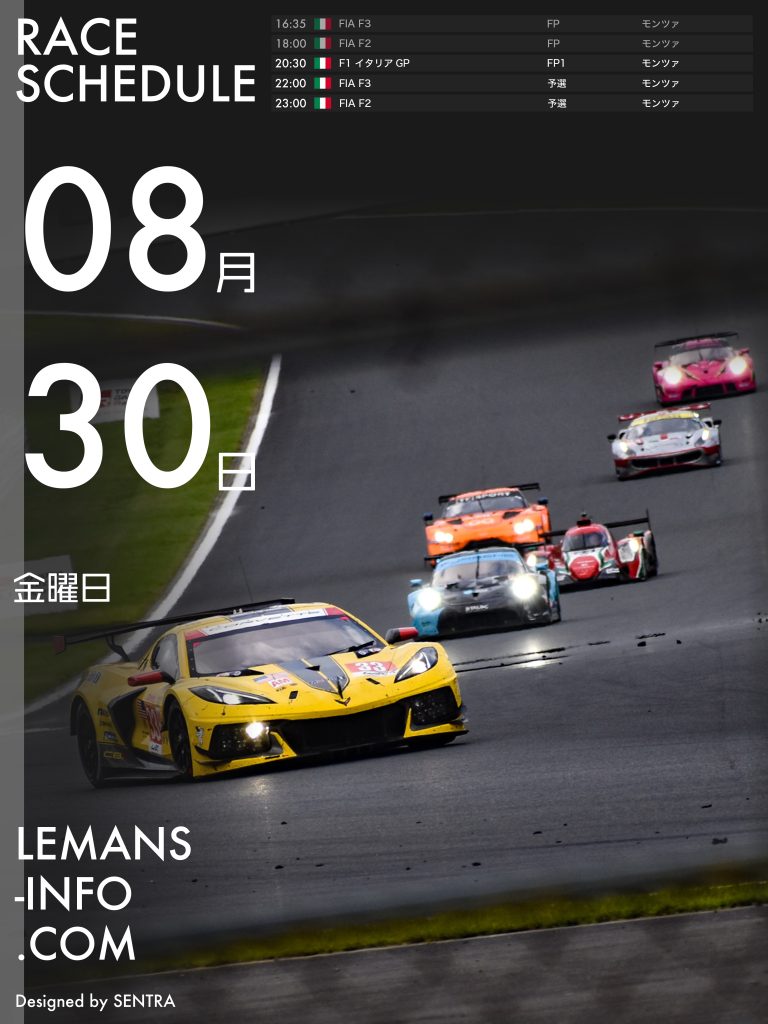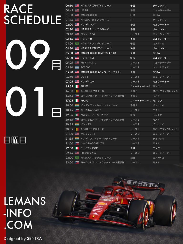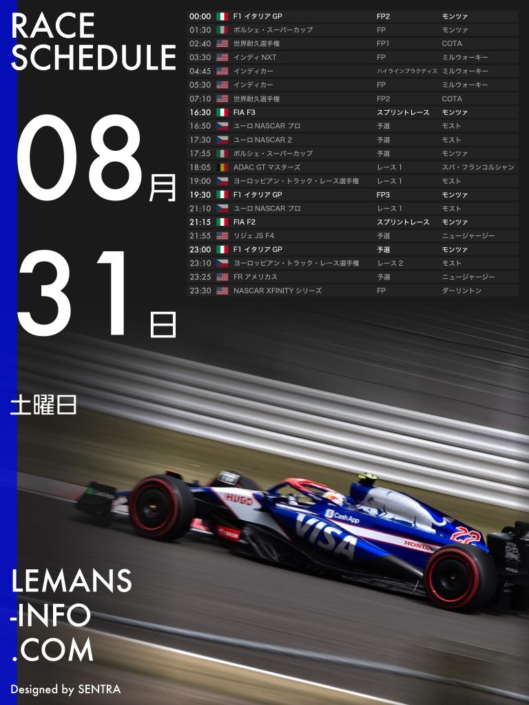 レーススケジュール8月30日から9月2日までのレーススケジュール。F1イタリアGP、F2、F3、WEC世界耐久選手権、インディカー、NASCARなどが開催される予定。飛雲バーターが参戦するインドF4とインディアン・レーシング・リーグはシリーズ初のナイトレースとなる。