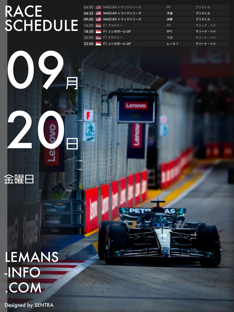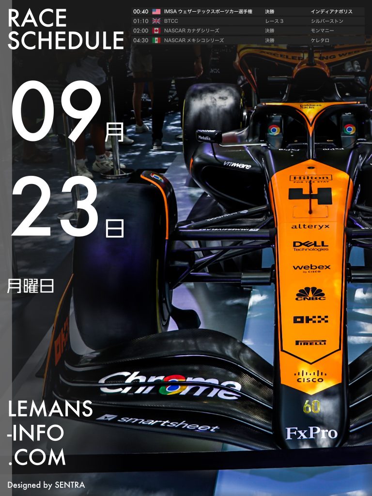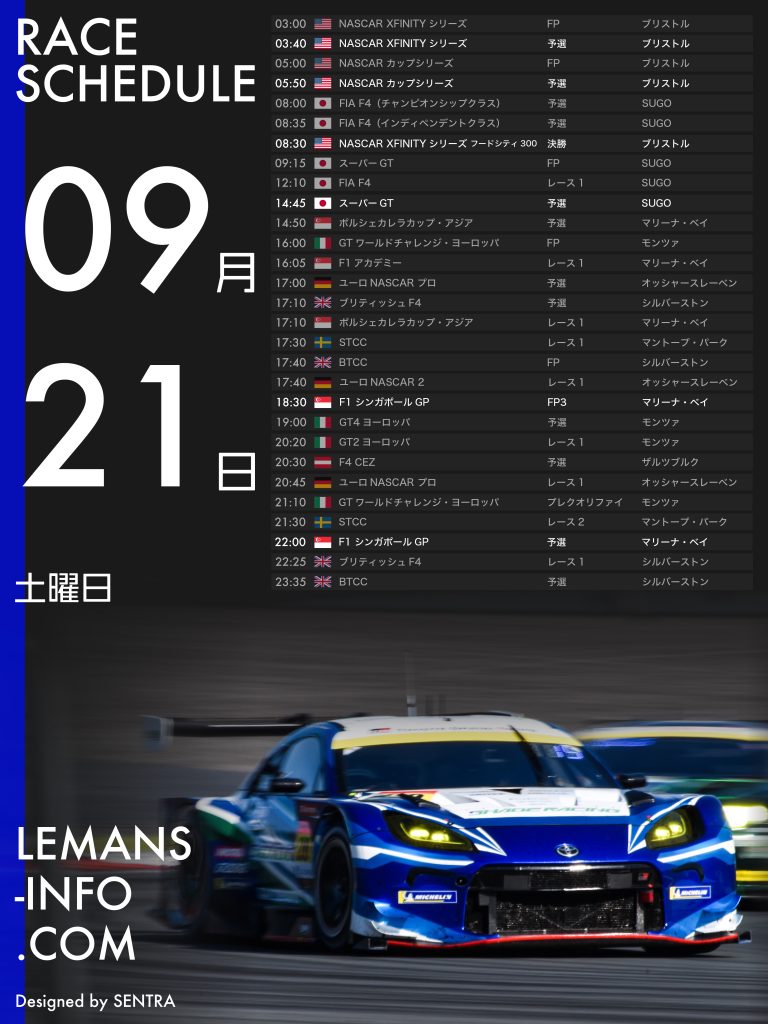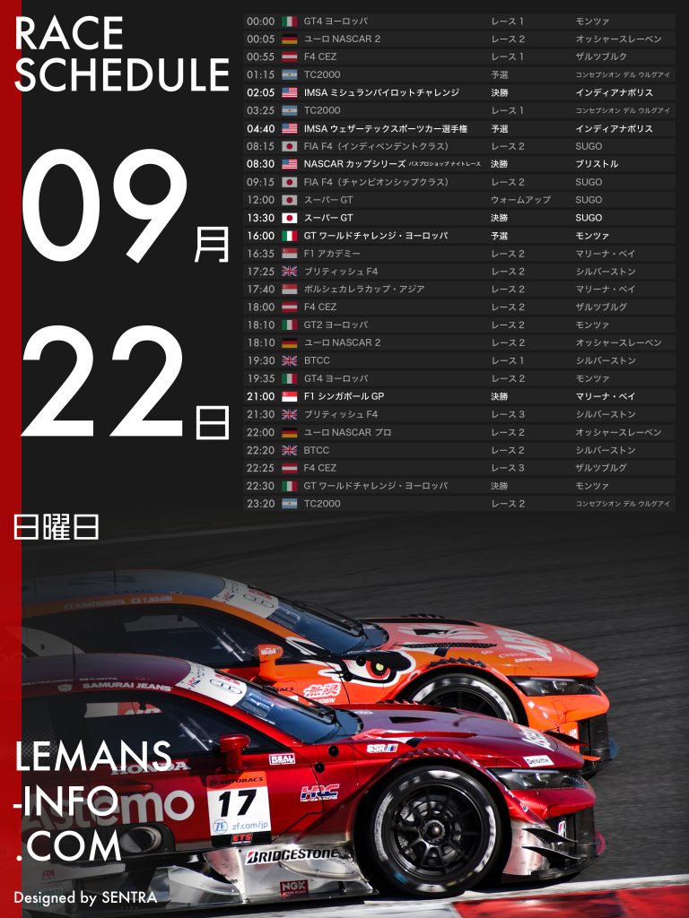 レーススケジュール9月6日から9月9日までのレーススケジュール。F1、スーパーGTを筆頭にさまざまなレースが行われる。STCC(スカンディナビア・ツーリングカー選手権)、F4 CEZ(セントラルヨーロッパゾーン)は最終戦。チャンピオン争いから目が離せない。