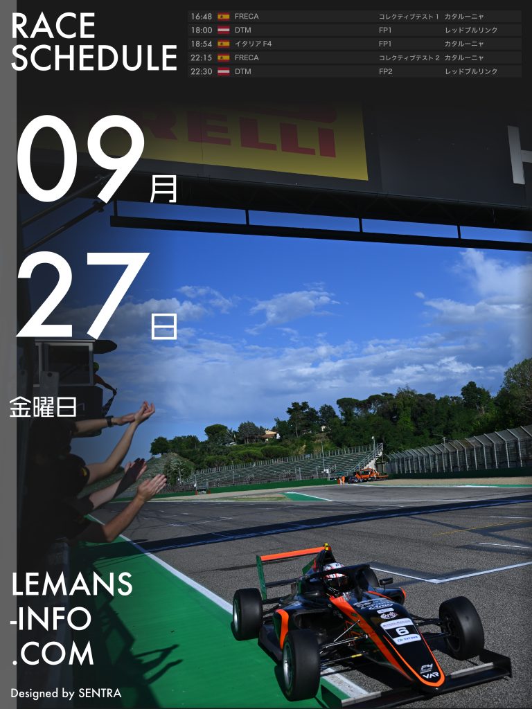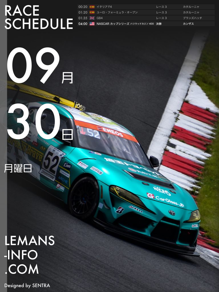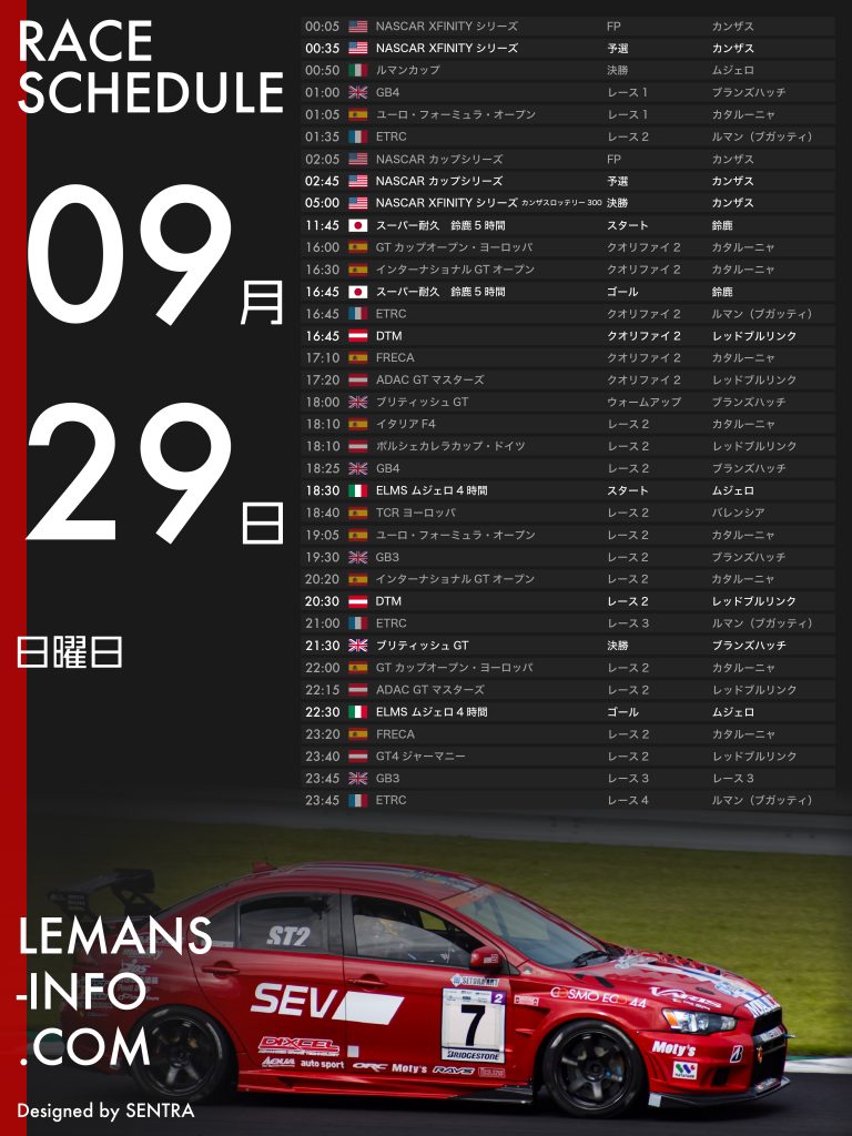 9月27日から9月30日までのレーススケジュール。スーパー耐久は鈴鹿、DTMはレッドブルリンク、ELMSはムジェロ、NASCARはカンザスで開催される。
