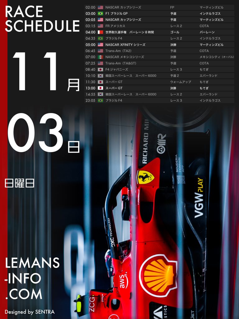 レーススケジュール11月1日から4日までのレーススケジュール。F1、WEC、スーパーGTなどが行われる。沼田拓海参戦のリジェJS F4は日本時間金曜朝から開催。F4 USと混走で3レース行われる。